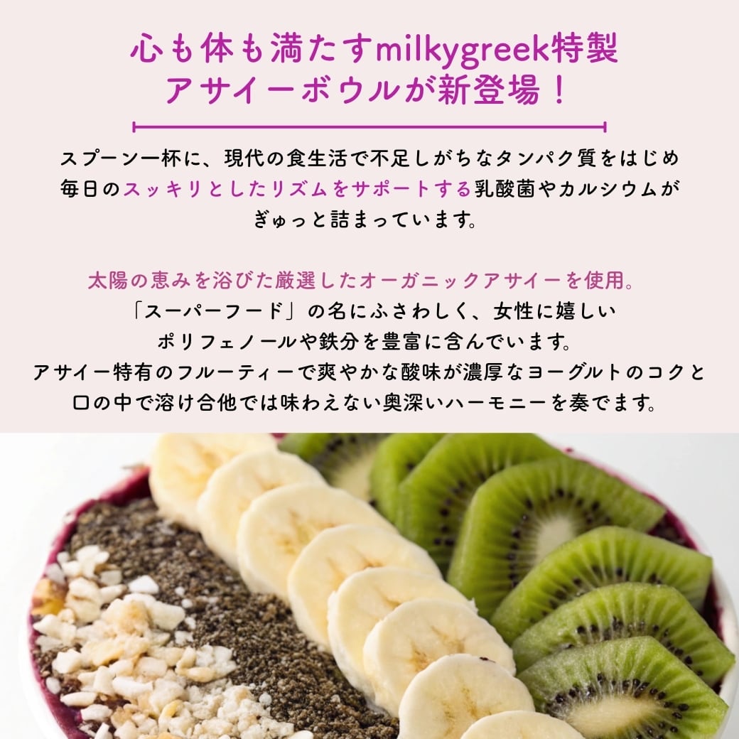 濃厚なコクと爽やかな酸味の“マリアージュ”。 心も体も満たすmilkygreek特製アサイーボウルが新登場!